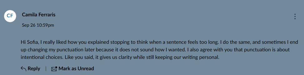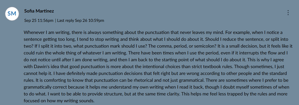 This activity was our first discussion forum, where we learned about the different ways punctuation works and reflected on our own punctuation habits. The prompt asked us to respond to questions about which punctuation system we use most, whether we’ve ever made a punctuation choice that “felt right,” and whether we agree that good writers don’t always follow strict handbook rules. After posting our response, we also had to reply to two classmates. For this portfolio, I included my reply to one of my classmates as evidence.