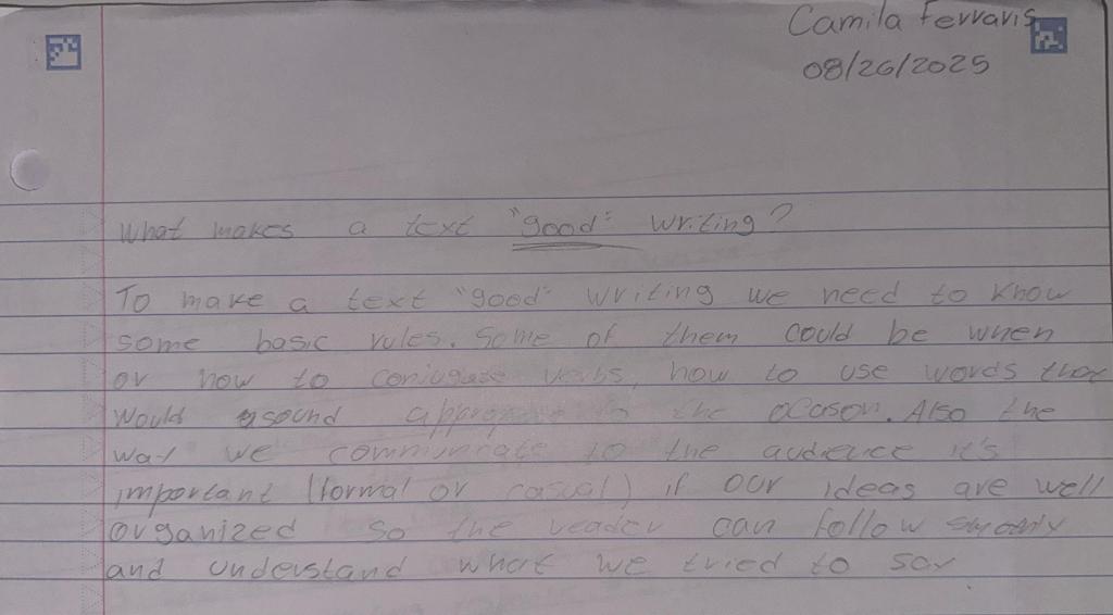 To establish a clear contrast with my other writing, a writing warm-up is a brief, timed exercise in which we respond immediately to a prompt provided by the teacher. Because these warm-ups are completed quickly, my sentences are often less connected, and I sometimes make grammatical errors or add notes in the margins as ideas occur. This spontaneous and unstructured style differs from Evidence One, which consists of a reply to a discussion post and is therefore more organized, and it contrasts even more strongly with Evidence Three, which is a complete essay and represents my most polished and developed writing.