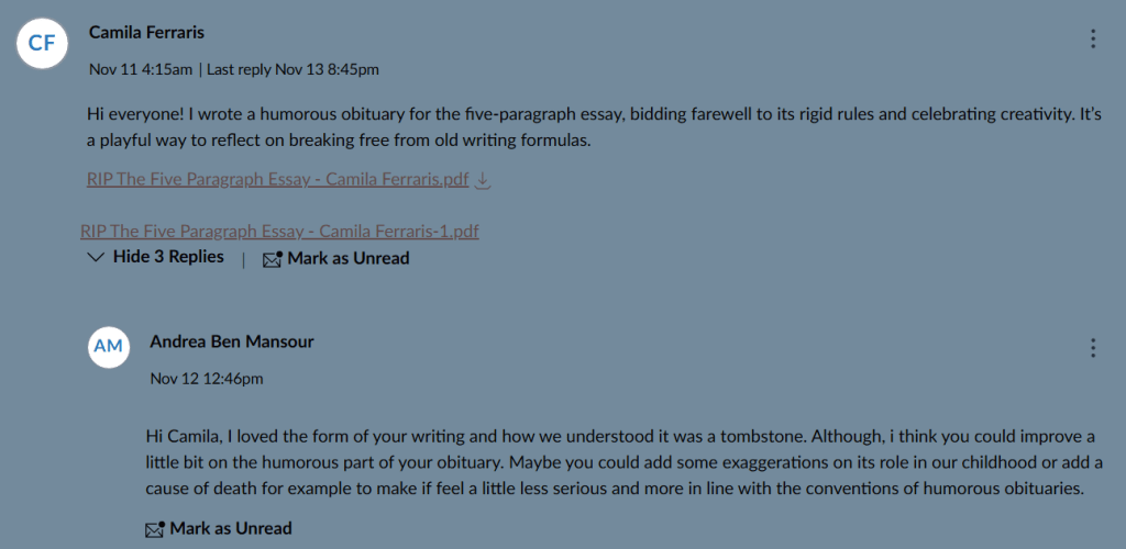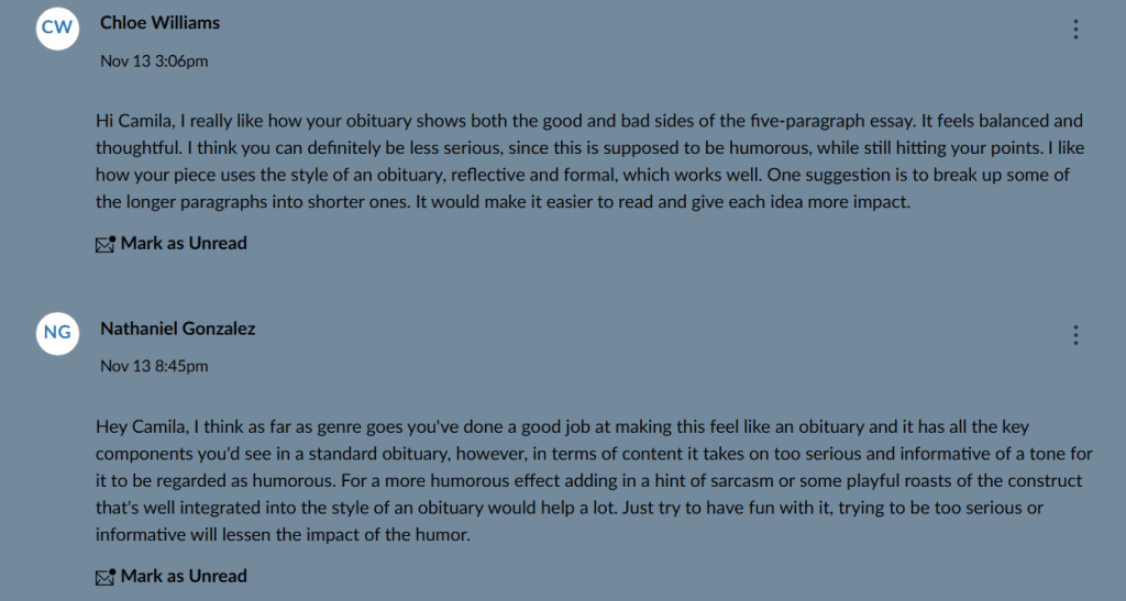 This activity was part of the “Adapting the Academic Essay: Genre Remix” project, where I transformed my original academic essay about the five-paragraph essay into a humorous obituary. The five-paragraph essay is a common structure taught in schools to help students organize ideas in an introduction, three body paragraphs, and a conclusion. For this assignment, I had to adapt my argument for a new audience and a creative genre, practicing rhetorical decision-making about tone, structure, and style. I shared my draft in a peer review discussion and received feedback from classmates and my instructor on how to improve humor, readability, and alignment with obituary conventions. I used these suggestions carefully, interpreting the feedback and applying multiple literacies such as reading, critical thinking, and reflective writing to revise my work and make meaningful improvements.
