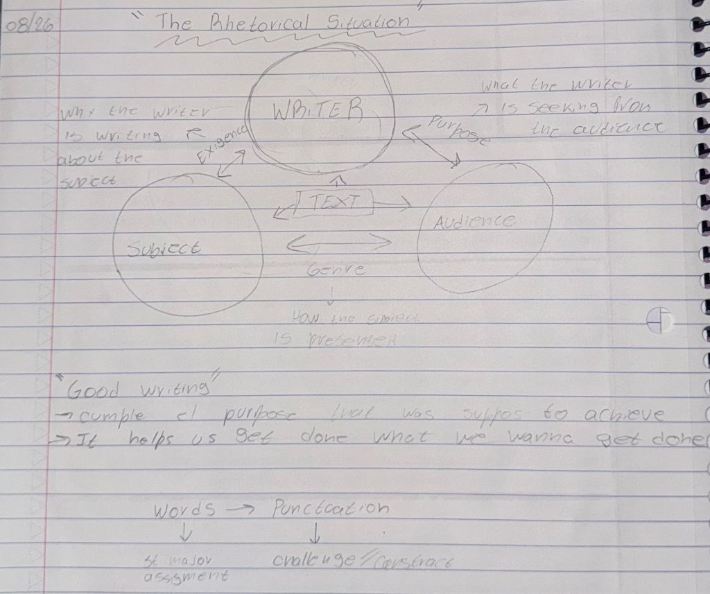 Understanding the rhetorical situation was one of the most important foundations for my work in this course, and my class notes helped me clearly break down how writing functions depending on the writer, the audience, the subject, and the purpose. In these notes, I mapped out how each element influences the choices a writer makes and how genre shapes the way a message is delivered. Studying these concepts showed me that effective writing depends on awareness, not just on following rules, because every writing task requires different decisions based on who will read it and what the writer wants to accomplish. I used what I learned from these notes throughout the semester to adjust my tone, structure, and approach in different assignments. By engaging with these ideas through listening, note-taking, and applying them to my own writing, I demonstrated my ability to use multiple literacies to analyze a writing situation and respond to it intentionally.