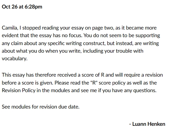 For this assignment, we were asked to write an academic essay that analyzed a writing construct. A writing construct is a rule or expectation that shapes the way students are taught to write, such as a specific structure or pattern that teachers often present as the “correct” way to organize ideas. The purpose of the assignment was to explain the construct clearly, examine why it exists, and evaluate how it affects writers. My first attempt at this assignment was titled “Breaking the Formula: How Paragraph Rules Can Silence Student Voices.” This draft did not meet the assignment expectations because I misunderstood the task. Instead of analyzing a writing construct, I focused too heavily on my personal struggles with writing. I described my feelings about structure and vocabulary, but I did not analyze an actual writing rule or explain its purpose. The essay lacked research, a clear argument, and a focused construct, so it earned an R score that required a complete revision.